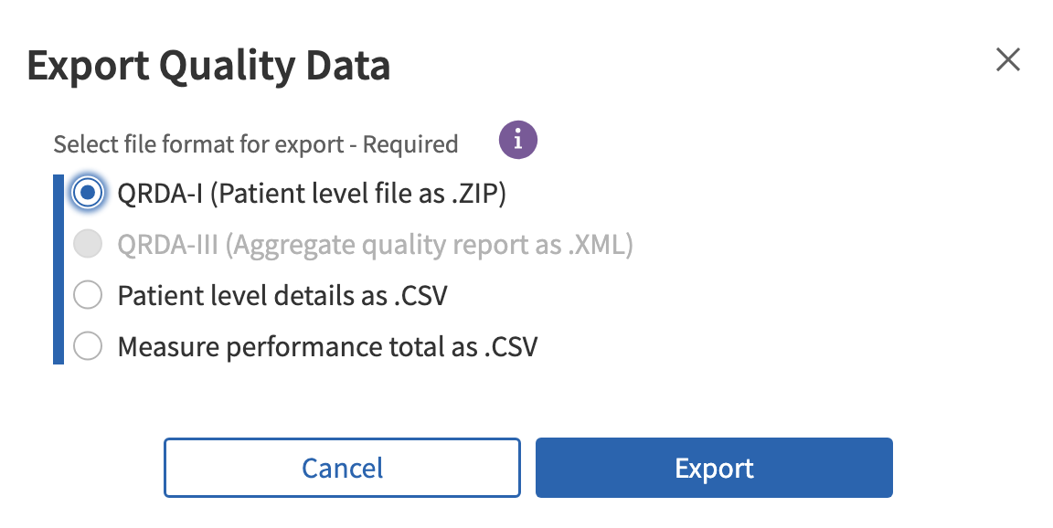 To generate and download the QRDA I files, click on Download, select QRDA-I and then Export: