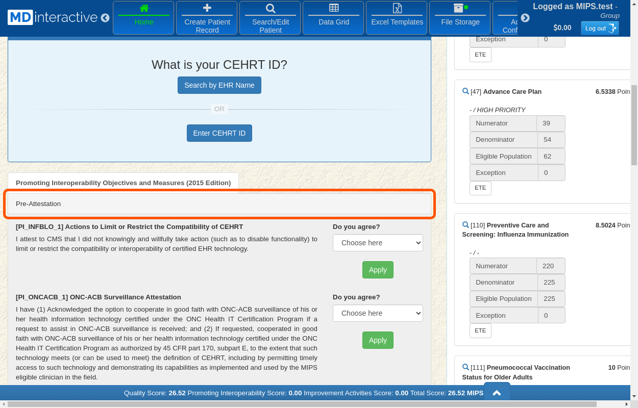 Complete the pre-attestation questions from CMS by choosing a response and clicking Apply.