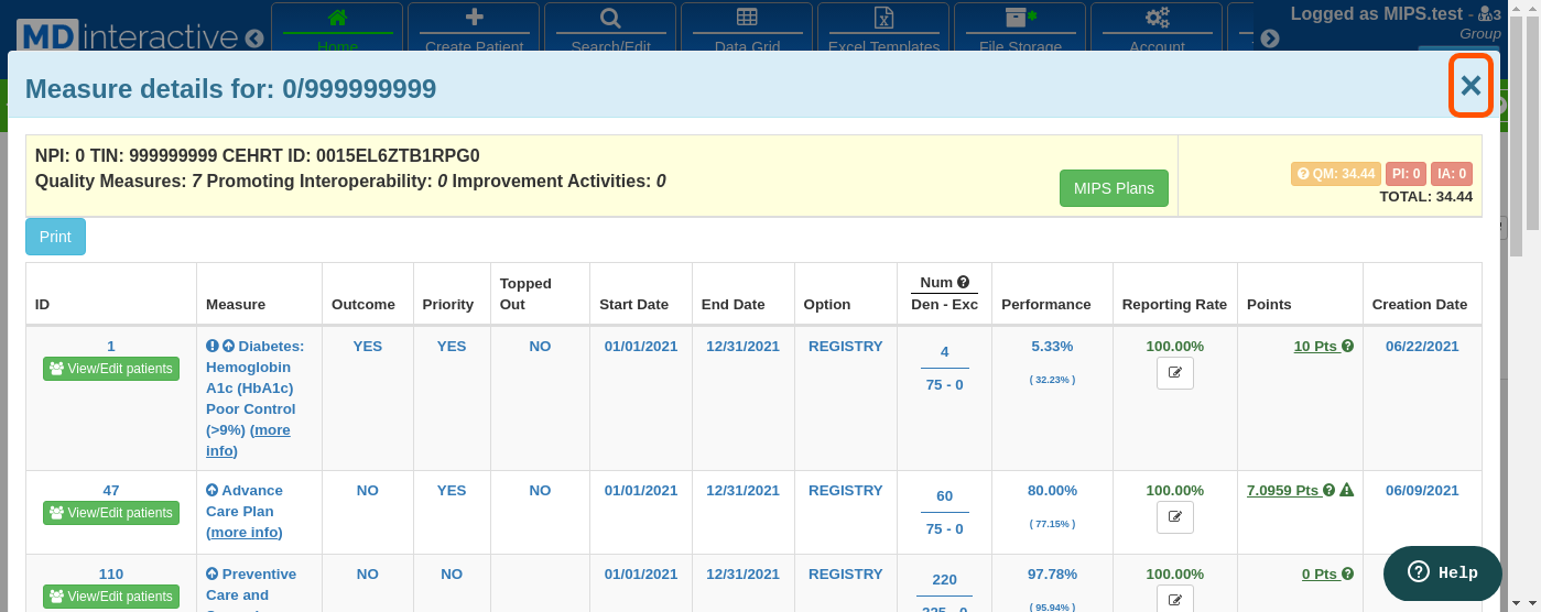 Click on the "X" in the upper right corner to close the Measure Detail Report and return to your MIPS Dashboard.