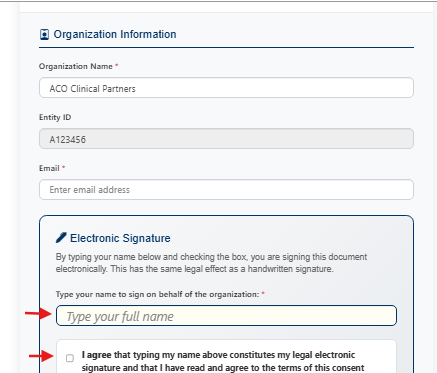 In the signature field, type your name to sign on behalf of the organization.
