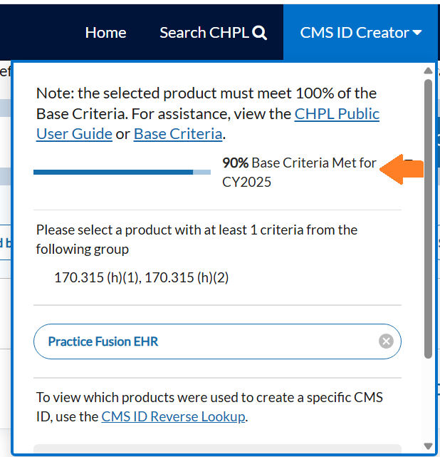 ⚠️Important: If it does not meet 100% Base Criteria, you will need to add any additional certified modules that you use with your EHR. If your organization uses multiple EHR systems, be sure to add each one before generating your CEHRT ID.