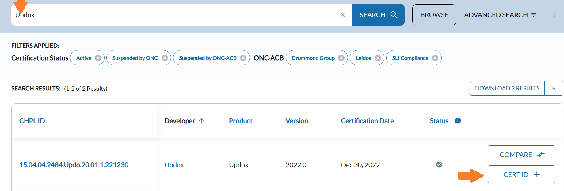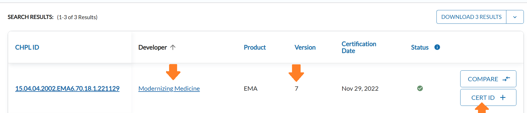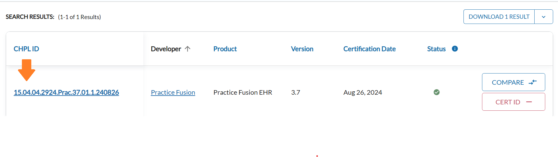 From the search results, find your EHR version and click the “CERT ID +” button on the right.