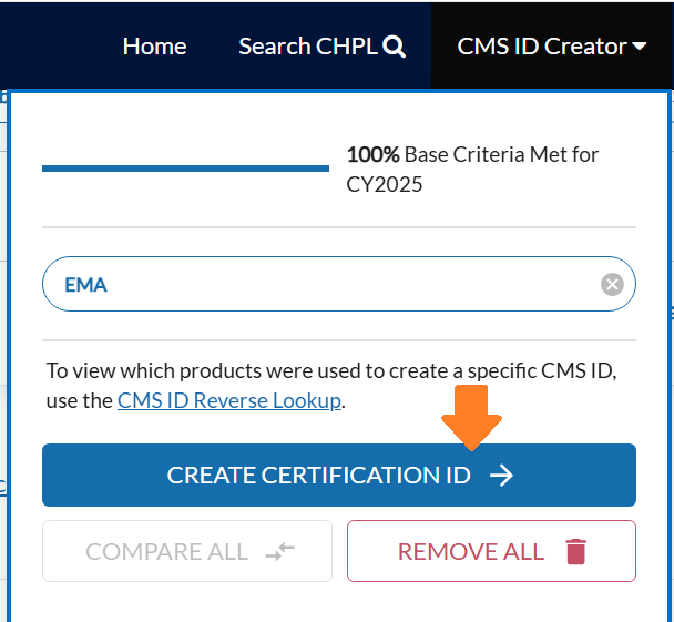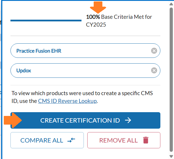 After adding all required products, your CEHRT listing should now show 100% of the Base Criteria. If it does, click “Create Certification ID.” A 15-character CEHRT ID will be displayed — copy and save this ID, as you will need it for your reporting.
